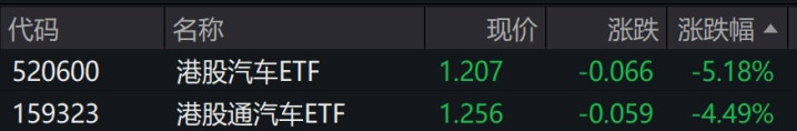 受盘面影响,跟踪中证港股通汽车产业主题指数的ETF跌逾4%。